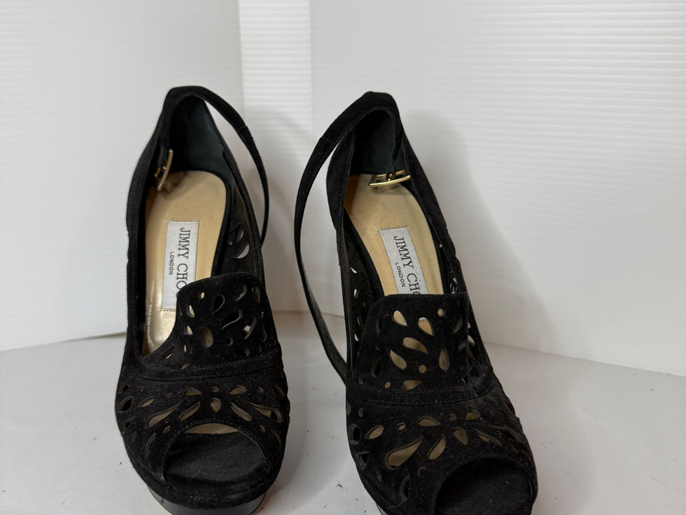 Discover elegance with our Jimmy Choo London Size 38.5EU at Not That Karen. This beautiful black suede peep toe high heel shoe is a timeless addition to any wardrobe. Expertly crafted and never worn, these exquisite shoes are made in Italy, reflecting skilled craftsmanship and luxury. Perfect for any upscale event, they seamlessly combine sophistication and style. Elevate your shoe collection with these pristine heels today.
